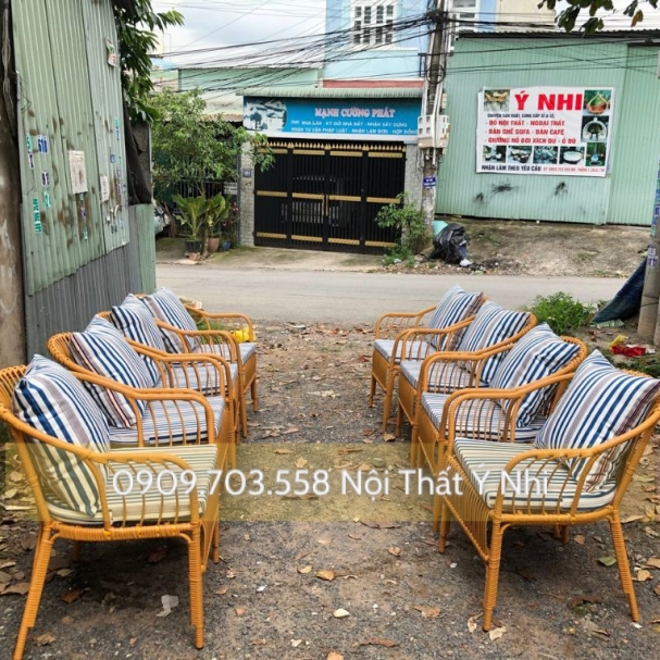 | Chất liệu: | Bàn Sắt + Ghế Đan Nhựa Giả Mây + Đệm Theo Yêu Cầu |